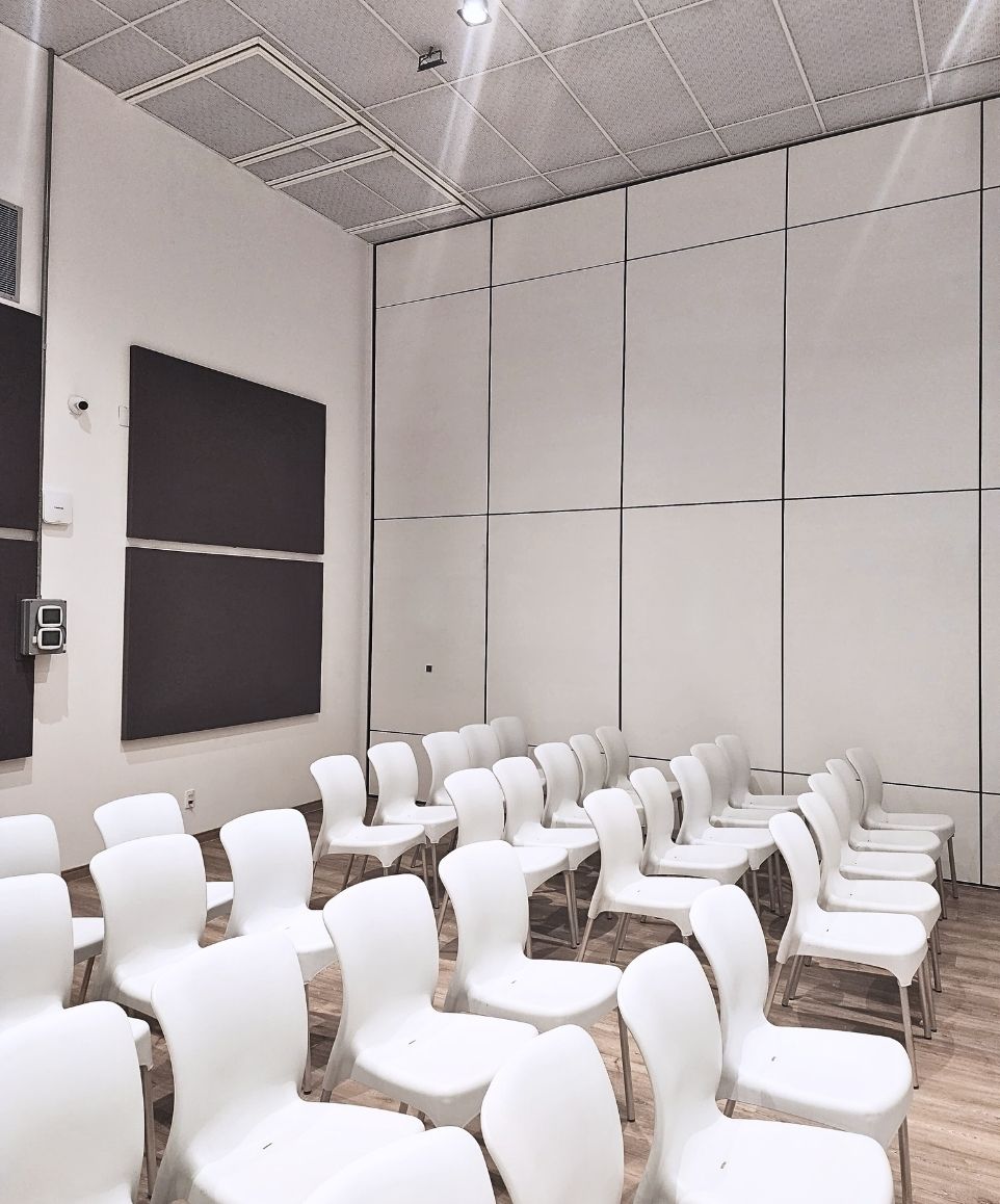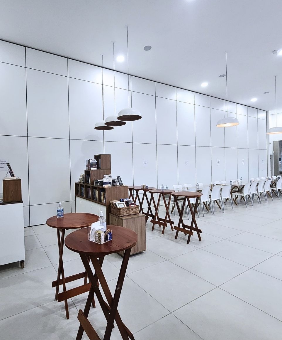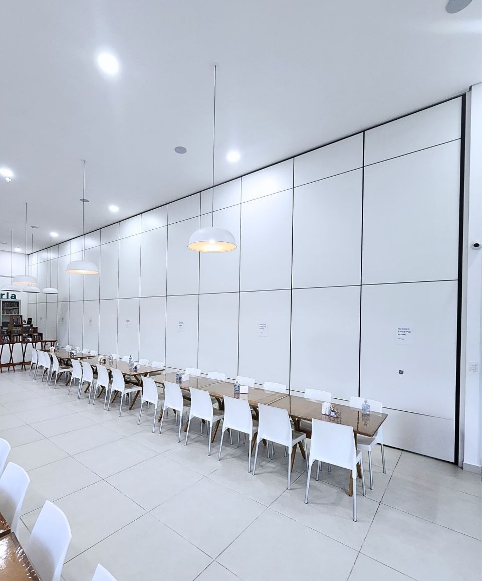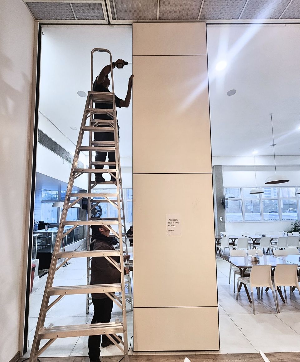 A solução escolhida foi o sistema de Divisórias Articolato Retráteis, ideal para locais que exigem flexibilidade na configuração dos espaços, sem comprometer o conforto acústico e visual.