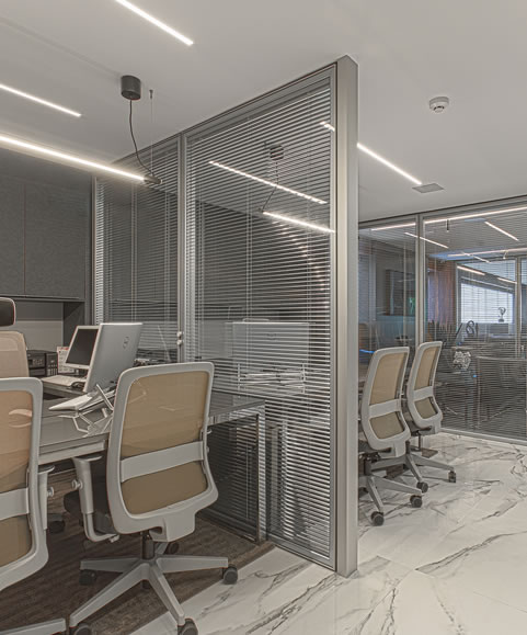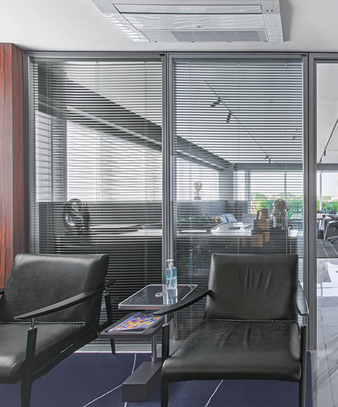 Serviço: Divisórias S90 Vidro Duplo com persiana motorizada e manual, perfil fosco