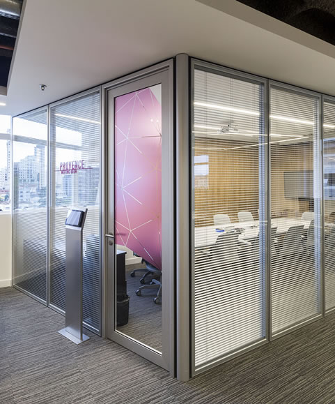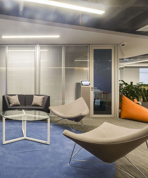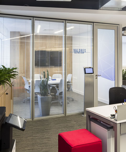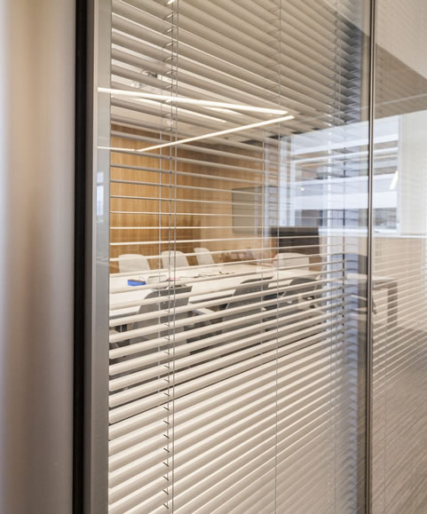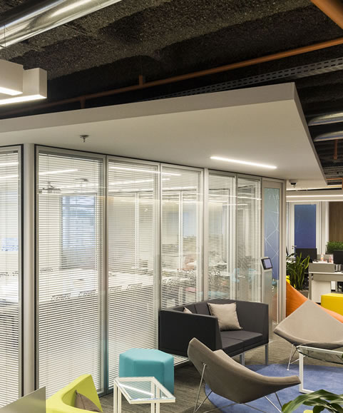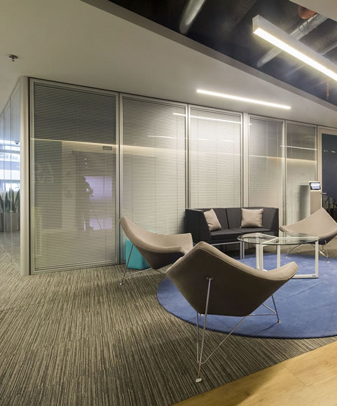 Produtos: Divisórias Vidro S90, Vidro Duplo com persiana e Mobiliários Corporativos